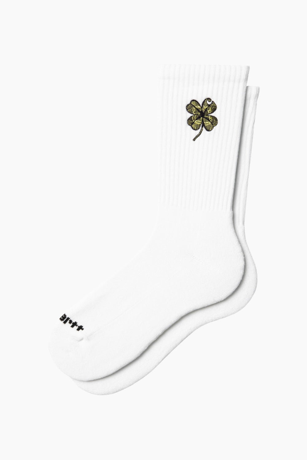 Clover Socks i farven White fra Carhartt WIP er klassiske hvide strømper med CARHARTT-logoet på spidsen og en broderet firekløver på siden.