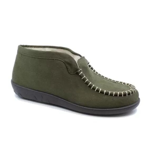 Art. nr. 2236-61Dejlig lun lukket hjemmesko fra Rohde lavet i olivengrøn tekstil med foer indvendigt og moccasin syning på fronten, den har en fast gummisål der er fleksibel og tåler at gå en smule udendørs.