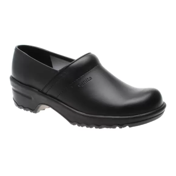 Sanita træsko, hvor sålen er lavet ekstra skridsikker og antistatiks. Overdelen er lavet i kraftig skind.